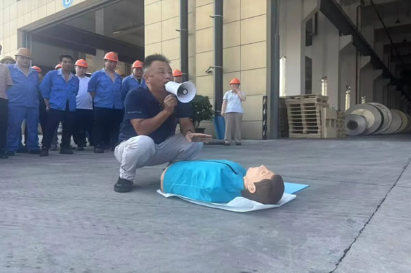 疏散完毕、清点人数后,公司消防维保单位专业人员采取现场演示、指导练习、现场实操相结合的方式生动地进行心肺复苏抢救知识培训。培训过程中,消防员特别强调抢救姿势、手法的正确性及其他相关要求。